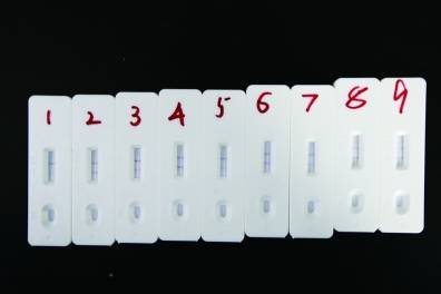 將檢測卡平放,用移液器或滴管吸取待檢樣品溶液,加入3滴于加樣孔中,加樣后開始計時;在5~8分鐘讀取結(jié)果。陽性:位置C顯示出條帶,位置T無條帶,表明樣品中黃曲霉毒素B1濃度高于限量。